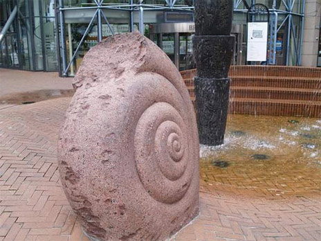 Skulpturen forestiller en ammonitt, en utdødd gruppe av blekkspruter. De er ikke funnet på fastlandet her i landet, men i jura- og krittlagene på Svalbard er det funnet en rekke arter av ammonitter.