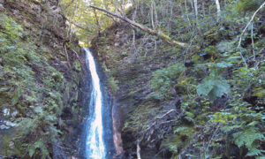 Like før vi gir opp, bestemmer vi oss for å følge en bekk nedover lia. Det ser mer lovende ut her. Nederst i bekken ligger en svær blotning. Vi går videre og finner enda en bekk. Mellomkambriske lag ligger i en vakker 15 meter høy vegg. Vannet styrter ned det må være Brøggers foss. Profilet er sjeldent fint, bortimot kontinuerlig gjennom 70-80 meter fra gneisen i grunnfjellet, så mellom- og overkambriske alunskifre, og med ordoviciske skifre og kalksteiner på toppen. Det er litt fuktig noen steder, og fossen må rappelleres, men ellers er lagrekken lett tilgjengelig.