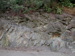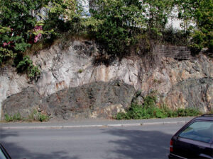 Tykke siller (lagerganger) fra karbon-perm skjærer gjennom alunskiferen. I motsetning til en dyke, som skjærer gjennom lagningen i den omkringliggende bergarten, går en sill parallelt med lagningen. Den lyse, syenittiske gangbergarten kalles lokalt mænaitt, eller mænaittporfyr når det er lyse “biter” (fenokrystaller) i den, som her. Noen steder kan vi se intrusjoner av ulik sammensetning som delvis skjærer hverandre.