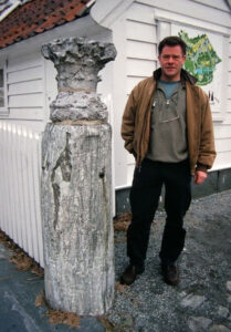 På et gatehjørne i Gamle Bergen Museum står en loslitt marmorsøyle. Min kollega Øystein Jansen og jeg stoppet opp ved den en gang, funderte på hvilken marmortype det var. Det viser seg å være en merkelig type som ikke ligner noen av de norske marmorforekomstene vi kjenner til. En kraftig bånding i hvitt og sjøgrønt, foldet sammen i et vakkert mønster.